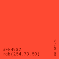 Цвет #FE4932 в цветовой модели RGB обозначается тремя октетами (254, 73, 50) в десятичном формате и #FE4932 в шестнадцатиричном (hex) формате, которые являются интенсивностью красного 254 (hex FE), интенсивность зелёного 73 (hex 49) и интенсивность синего 50 (hex 32).