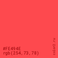 Цвет #FE494E в цветовой модели RGB обозначается тремя октетами (254, 73, 78) в десятичном формате и #FE494E в шестнадцатиричном (hex) формате, которые являются интенсивностью красного 254 (hex FE), интенсивность зелёного 73 (hex 49) и интенсивность синего 78 (hex 4E).