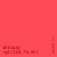 Цвет #FE4A56 в цветовой модели RGB обозначается тремя октетами (254, 74, 86) в десятичном формате и #FE4A56 в шестнадцатиричном (hex) формате, которые являются интенсивностью красного 254 (hex FE), интенсивность зелёного 74 (hex 4A) и интенсивность синего 86 (hex 56).