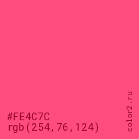 Цвет #FE4C7C в цветовой модели RGB обозначается тремя октетами (254, 76, 124) в десятичном формате и #FE4C7C в шестнадцатиричном (hex) формате, которые являются интенсивностью красного 254 (hex FE), интенсивность зелёного 76 (hex 4C) и интенсивность синего 124 (hex 7C).