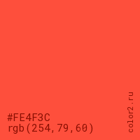 Цвет #FE4F3C в цветовой модели RGB обозначается тремя октетами (254, 79, 60) в десятичном формате и #FE4F3C в шестнадцатиричном (hex) формате, которые являются интенсивностью красного 254 (hex FE), интенсивность зелёного 79 (hex 4F) и интенсивность синего 60 (hex 3C).