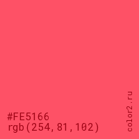 Цвет #FE5166 в цветовой модели RGB обозначается тремя октетами (254, 81, 102) в десятичном формате и #FE5166 в шестнадцатиричном (hex) формате, которые являются интенсивностью красного 254 (hex FE), интенсивность зелёного 81 (hex 51) и интенсивность синего 102 (hex 66).