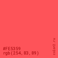Цвет #FE5359 в цветовой модели RGB обозначается тремя октетами (254, 83, 89) в десятичном формате и #FE5359 в шестнадцатиричном (hex) формате, которые являются интенсивностью красного 254 (hex FE), интенсивность зелёного 83 (hex 53) и интенсивность синего 89 (hex 59).