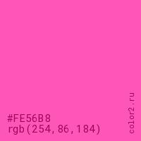 Цвет #FE56B8 в цветовой модели RGB обозначается тремя октетами (254, 86, 184) в десятичном формате и #FE56B8 в шестнадцатиричном (hex) формате, которые являются интенсивностью красного 254 (hex FE), интенсивность зелёного 86 (hex 56) и интенсивность синего 184 (hex B8).