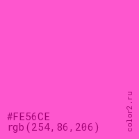Цвет #FE56CE в цветовой модели RGB обозначается тремя октетами (254, 86, 206) в десятичном формате и #FE56CE в шестнадцатиричном (hex) формате, которые являются интенсивностью красного 254 (hex FE), интенсивность зелёного 86 (hex 56) и интенсивность синего 206 (hex CE).
