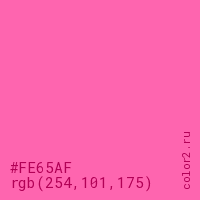 Цвет #FE65AF в цветовой модели RGB обозначается тремя октетами (254, 101, 175) в десятичном формате и #FE65AF в шестнадцатиричном (hex) формате, которые являются интенсивностью красного 254 (hex FE), интенсивность зелёного 101 (hex 65) и интенсивность синего 175 (hex AF).