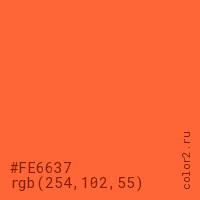 Цвет #FE6637 в цветовой модели RGB обозначается тремя октетами (254, 102, 55) в десятичном формате и #FE6637 в шестнадцатиричном (hex) формате, которые являются интенсивностью красного 254 (hex FE), интенсивность зелёного 102 (hex 66) и интенсивность синего 55 (hex 37).