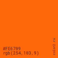 Цвет #FE6709 в цветовой модели RGB обозначается тремя октетами (254, 103, 9) в десятичном формате и #FE6709 в шестнадцатиричном (hex) формате, которые являются интенсивностью красного 254 (hex FE), интенсивность зелёного 103 (hex 67) и интенсивность синего 9 (hex 09).