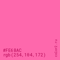 Цвет #FE68AC в цветовой модели RGB обозначается тремя октетами (254, 104, 172) в десятичном формате и #FE68AC в шестнадцатиричном (hex) формате, которые являются интенсивностью красного 254 (hex FE), интенсивность зелёного 104 (hex 68) и интенсивность синего 172 (hex AC).