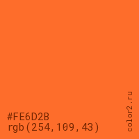 Цвет #FE6D2B в цветовой модели RGB обозначается тремя октетами (254, 109, 43) в десятичном формате и #FE6D2B в шестнадцатиричном (hex) формате, которые являются интенсивностью красного 254 (hex FE), интенсивность зелёного 109 (hex 6D) и интенсивность синего 43 (hex 2B).