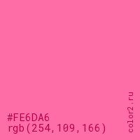 Цвет #FE6DA6 в цветовой модели RGB обозначается тремя октетами (254, 109, 166) в десятичном формате и #FE6DA6 в шестнадцатиричном (hex) формате, которые являются интенсивностью красного 254 (hex FE), интенсивность зелёного 109 (hex 6D) и интенсивность синего 166 (hex A6).