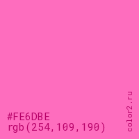 Цвет #FE6DBE в цветовой модели RGB обозначается тремя октетами (254, 109, 190) в десятичном формате и #FE6DBE в шестнадцатиричном (hex) формате, которые являются интенсивностью красного 254 (hex FE), интенсивность зелёного 109 (hex 6D) и интенсивность синего 190 (hex BE).