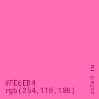 Цвет #FE6EB4 в цветовой модели RGB обозначается тремя октетами (254, 110, 180) в десятичном формате и #FE6EB4 в шестнадцатиричном (hex) формате, которые являются интенсивностью красного 254 (hex FE), интенсивность зелёного 110 (hex 6E) и интенсивность синего 180 (hex B4).