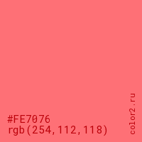 Цвет #FE7076 в цветовой модели RGB обозначается тремя октетами (254, 112, 118) в десятичном формате и #FE7076 в шестнадцатиричном (hex) формате, которые являются интенсивностью красного 254 (hex FE), интенсивность зелёного 112 (hex 70) и интенсивность синего 118 (hex 76).
