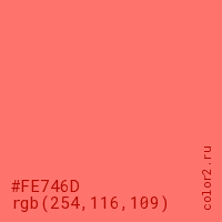 Цвет #FE746D в цветовой модели RGB обозначается тремя октетами (254, 116, 109) в десятичном формате и #FE746D в шестнадцатиричном (hex) формате, которые являются интенсивностью красного 254 (hex FE), интенсивность зелёного 116 (hex 74) и интенсивность синего 109 (hex 6D).