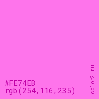 Цвет #FE74EB в цветовой модели RGB обозначается тремя октетами (254, 116, 235) в десятичном формате и #FE74EB в шестнадцатиричном (hex) формате, которые являются интенсивностью красного 254 (hex FE), интенсивность зелёного 116 (hex 74) и интенсивность синего 235 (hex EB).