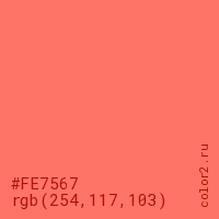 Цвет #FE7567 в цветовой модели RGB обозначается тремя октетами (254, 117, 103) в десятичном формате и #FE7567 в шестнадцатиричном (hex) формате, которые являются интенсивностью красного 254 (hex FE), интенсивность зелёного 117 (hex 75) и интенсивность синего 103 (hex 67).