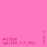 Цвет #FE75C0 в цветовой модели RGB обозначается тремя октетами (254, 117, 192) в десятичном формате и #FE75C0 в шестнадцатиричном (hex) формате, которые являются интенсивностью красного 254 (hex FE), интенсивность зелёного 117 (hex 75) и интенсивность синего 192 (hex C0).