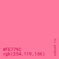 Цвет #FE779C в цветовой модели RGB обозначается тремя октетами (254, 119, 156) в десятичном формате и #FE779C в шестнадцатиричном (hex) формате, которые являются интенсивностью красного 254 (hex FE), интенсивность зелёного 119 (hex 77) и интенсивность синего 156 (hex 9C).