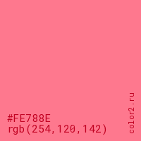 Цвет #FE788E в цветовой модели RGB обозначается тремя октетами (254, 120, 142) в десятичном формате и #FE788E в шестнадцатиричном (hex) формате, которые являются интенсивностью красного 254 (hex FE), интенсивность зелёного 120 (hex 78) и интенсивность синего 142 (hex 8E).