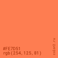 Цвет #FE7D51 в цветовой модели RGB обозначается тремя октетами (254, 125, 81) в десятичном формате и #FE7D51 в шестнадцатиричном (hex) формате, которые являются интенсивностью красного 254 (hex FE), интенсивность зелёного 125 (hex 7D) и интенсивность синего 81 (hex 51).