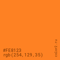 Цвет #FE8123 в цветовой модели RGB обозначается тремя октетами (254, 129, 35) в десятичном формате и #FE8123 в шестнадцатиричном (hex) формате, которые являются интенсивностью красного 254 (hex FE), интенсивность зелёного 129 (hex 81) и интенсивность синего 35 (hex 23).