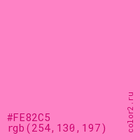Цвет #FE82C5 в цветовой модели RGB обозначается тремя октетами (254, 130, 197) в десятичном формате и #FE82C5 в шестнадцатиричном (hex) формате, которые являются интенсивностью красного 254 (hex FE), интенсивность зелёного 130 (hex 82) и интенсивность синего 197 (hex C5).