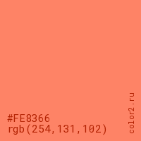 Цвет #FE8366 в цветовой модели RGB обозначается тремя октетами (254, 131, 102) в десятичном формате и #FE8366 в шестнадцатиричном (hex) формате, которые являются интенсивностью красного 254 (hex FE), интенсивность зелёного 131 (hex 83) и интенсивность синего 102 (hex 66).