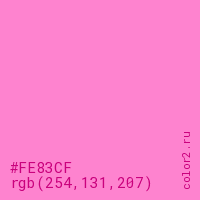 Цвет #FE83CF в цветовой модели RGB обозначается тремя октетами (254, 131, 207) в десятичном формате и #FE83CF в шестнадцатиричном (hex) формате, которые являются интенсивностью красного 254 (hex FE), интенсивность зелёного 131 (hex 83) и интенсивность синего 207 (hex CF).