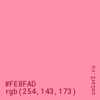 Цвет #FE8FAD в цветовой модели RGB обозначается тремя октетами (254, 143, 173) в десятичном формате и #FE8FAD в шестнадцатиричном (hex) формате, которые являются интенсивностью красного 254 (hex FE), интенсивность зелёного 143 (hex 8F) и интенсивность синего 173 (hex AD).