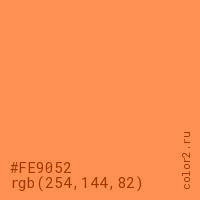 Цвет #FE9052 в цветовой модели RGB обозначается тремя октетами (254, 144, 82) в десятичном формате и #FE9052 в шестнадцатиричном (hex) формате, которые являются интенсивностью красного 254 (hex FE), интенсивность зелёного 144 (hex 90) и интенсивность синего 82 (hex 52).