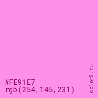 Цвет #FE91E7 в цветовой модели RGB обозначается тремя октетами (254, 145, 231) в десятичном формате и #FE91E7 в шестнадцатиричном (hex) формате, которые являются интенсивностью красного 254 (hex FE), интенсивность зелёного 145 (hex 91) и интенсивность синего 231 (hex E7).