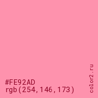 Цвет #FE92AD в цветовой модели RGB обозначается тремя октетами (254, 146, 173) в десятичном формате и #FE92AD в шестнадцатиричном (hex) формате, которые являются интенсивностью красного 254 (hex FE), интенсивность зелёного 146 (hex 92) и интенсивность синего 173 (hex AD).
