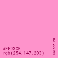 Цвет #FE93CB в цветовой модели RGB обозначается тремя октетами (254, 147, 203) в десятичном формате и #FE93CB в шестнадцатиричном (hex) формате, которые являются интенсивностью красного 254 (hex FE), интенсивность зелёного 147 (hex 93) и интенсивность синего 203 (hex CB).