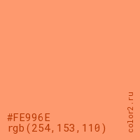 Цвет #FE996E в цветовой модели RGB обозначается тремя октетами (254, 153, 110) в десятичном формате и #FE996E в шестнадцатиричном (hex) формате, которые являются интенсивностью красного 254 (hex FE), интенсивность зелёного 153 (hex 99) и интенсивность синего 110 (hex 6E).