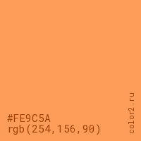 Цвет #FE9C5A в цветовой модели RGB обозначается тремя октетами (254, 156, 90) в десятичном формате и #FE9C5A в шестнадцатиричном (hex) формате, которые являются интенсивностью красного 254 (hex FE), интенсивность зелёного 156 (hex 9C) и интенсивность синего 90 (hex 5A).