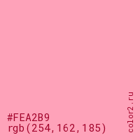 Цвет #FEA2B9 в цветовой модели RGB обозначается тремя октетами (254, 162, 185) в десятичном формате и #FEA2B9 в шестнадцатиричном (hex) формате, которые являются интенсивностью красного 254 (hex FE), интенсивность зелёного 162 (hex A2) и интенсивность синего 185 (hex B9).