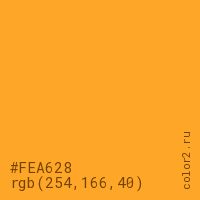 Цвет #FEA628 в цветовой модели RGB обозначается тремя октетами (254, 166, 40) в десятичном формате и #FEA628 в шестнадцатиричном (hex) формате, которые являются интенсивностью красного 254 (hex FE), интенсивность зелёного 166 (hex A6) и интенсивность синего 40 (hex 28).