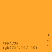 Цвет #FEA72B в цветовой модели RGB обозначается тремя октетами (254, 167, 43) в десятичном формате и #FEA72B в шестнадцатиричном (hex) формате, которые являются интенсивностью красного 254 (hex FE), интенсивность зелёного 167 (hex A7) и интенсивность синего 43 (hex 2B).