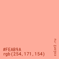 Цвет #FEAB9A в цветовой модели RGB обозначается тремя октетами (254, 171, 154) в десятичном формате и #FEAB9A в шестнадцатиричном (hex) формате, которые являются интенсивностью красного 254 (hex FE), интенсивность зелёного 171 (hex AB) и интенсивность синего 154 (hex 9A).