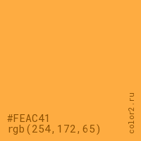 Цвет #FEAC41 в цветовой модели RGB обозначается тремя октетами (254, 172, 65) в десятичном формате и #FEAC41 в шестнадцатиричном (hex) формате, которые являются интенсивностью красного 254 (hex FE), интенсивность зелёного 172 (hex AC) и интенсивность синего 65 (hex 41).