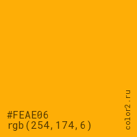 Цвет #FEAE06 в цветовой модели RGB обозначается тремя октетами (254, 174, 6) в десятичном формате и #FEAE06 в шестнадцатиричном (hex) формате, которые являются интенсивностью красного 254 (hex FE), интенсивность зелёного 174 (hex AE) и интенсивность синего 6 (hex 06).