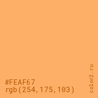 Цвет #FEAF67 в цветовой модели RGB обозначается тремя октетами (254, 175, 103) в десятичном формате и #FEAF67 в шестнадцатиричном (hex) формате, которые являются интенсивностью красного 254 (hex FE), интенсивность зелёного 175 (hex AF) и интенсивность синего 103 (hex 67).