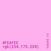 Цвет #FEAFEE в цветовой модели RGB обозначается тремя октетами (254, 175, 238) в десятичном формате и #FEAFEE в шестнадцатиричном (hex) формате, которые являются интенсивностью красного 254 (hex FE), интенсивность зелёного 175 (hex AF) и интенсивность синего 238 (hex EE).