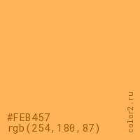 Цвет #FEB457 в цветовой модели RGB обозначается тремя октетами (254, 180, 87) в десятичном формате и #FEB457 в шестнадцатиричном (hex) формате, которые являются интенсивностью красного 254 (hex FE), интенсивность зелёного 180 (hex B4) и интенсивность синего 87 (hex 57).