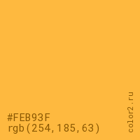 Цвет #FEB93F в цветовой модели RGB обозначается тремя октетами (254, 185, 63) в десятичном формате и #FEB93F в шестнадцатиричном (hex) формате, которые являются интенсивностью красного 254 (hex FE), интенсивность зелёного 185 (hex B9) и интенсивность синего 63 (hex 3F).