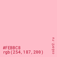 Цвет #FEBBC8 в цветовой модели RGB обозначается тремя октетами (254, 187, 200) в десятичном формате и #FEBBC8 в шестнадцатиричном (hex) формате, которые являются интенсивностью красного 254 (hex FE), интенсивность зелёного 187 (hex BB) и интенсивность синего 200 (hex C8).