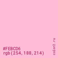 Цвет #FEBCD6 в цветовой модели RGB обозначается тремя октетами (254, 188, 214) в десятичном формате и #FEBCD6 в шестнадцатиричном (hex) формате, которые являются интенсивностью красного 254 (hex FE), интенсивность зелёного 188 (hex BC) и интенсивность синего 214 (hex D6).