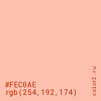 Цвет #FEC0AE в цветовой модели RGB обозначается тремя октетами (254, 192, 174) в десятичном формате и #FEC0AE в шестнадцатиричном (hex) формате, которые являются интенсивностью красного 254 (hex FE), интенсивность зелёного 192 (hex C0) и интенсивность синего 174 (hex AE).