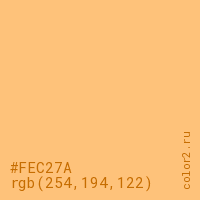Цвет #FEC27A в цветовой модели RGB обозначается тремя октетами (254, 194, 122) в десятичном формате и #FEC27A в шестнадцатиричном (hex) формате, которые являются интенсивностью красного 254 (hex FE), интенсивность зелёного 194 (hex C2) и интенсивность синего 122 (hex 7A).